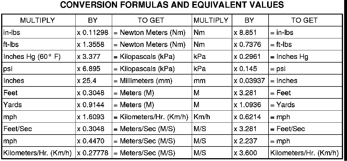 Refer to the Metric Conversion Chart to convert torque values listed in metric Newton Meters (Nm). Also, use the chart to convert between millimeters (mm) and inches (in.).