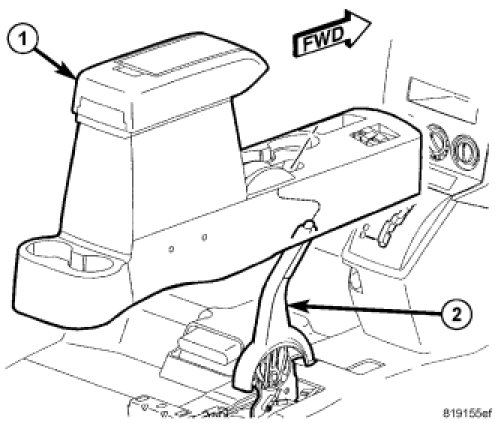 1. Position the console (1) into the vehicle and down over the park break lever (2).
