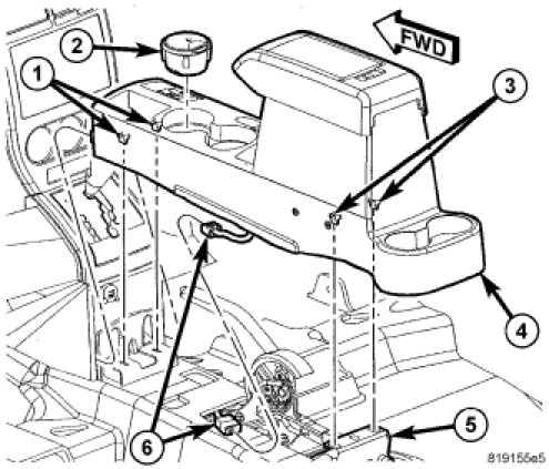 3. Position the front of the console (4) up into the shifter console and position the front clips (1).