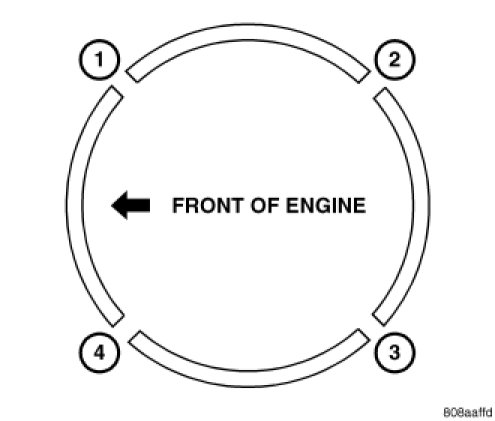 3. Before installing the ring compressor, make sure the oil ring expander ends are butted (1) and the rail gaps (2,4) located as shown above. As viewed from the top of the piston.
