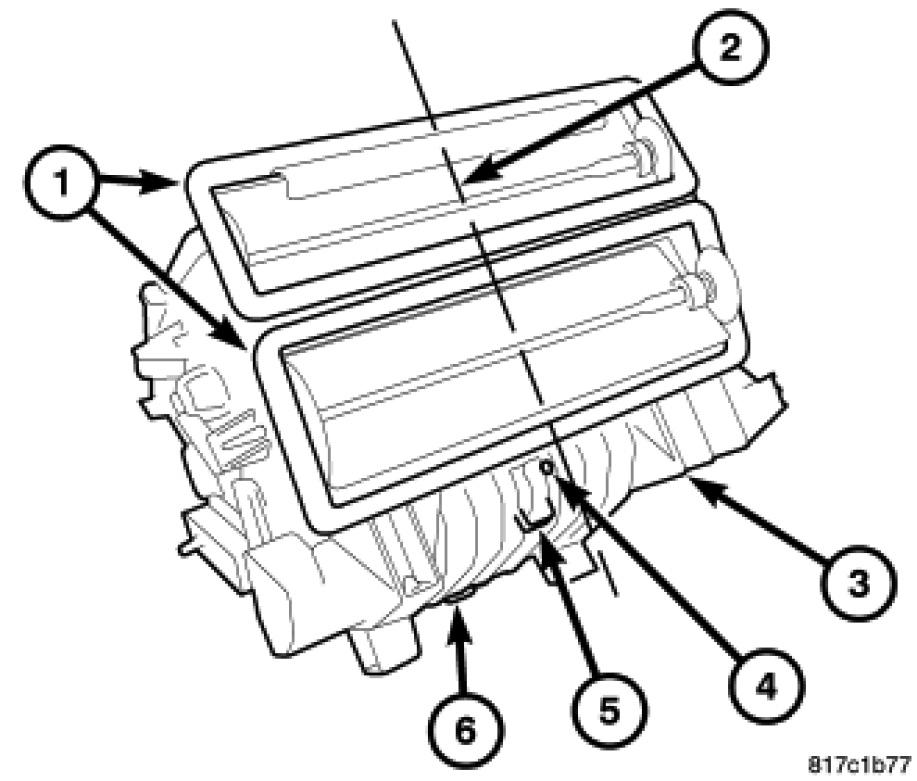 3. Align the air door(s) with the pivot shaft hole(s) in the air distribution housing (3) and install the two halves of the housing together. Make sure the three plastic retaining tabs (6) are fully engaged.