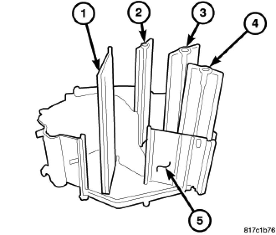 1. Install the four mode door levers (1, 2, 3 and 4) onto the right side of the air distribution housing (5) Make sure the lever retaining tabs are fully engaged to the housing.