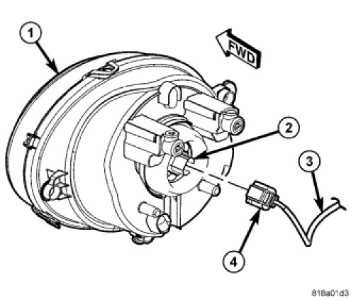 5. On domestic market vehicles only, disconnect the engine compartment wire harness (3) connector (4) from the headlamp bulb connector receptacle (2).