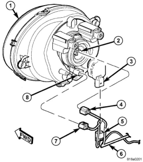 6. On export market vehicles only, disconnect the engine compartment wire harness (6) connector (4) from the headlamp bulb terminals (2), the connector (7) from the position lamp connector receptacle (8), and the connector (5) from the headlamp leveling motor connector receptacle (3).