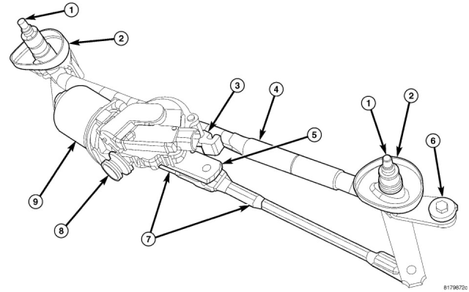 - Pivots - The two front wiper pivots (1) are secured to the ends of the wiper module bracket. The lever arms that extend from the bottom of the pivot shafts each have ball studs that engage the bushings of the drive links. A molded plastic shield (2) is fit over the top of each pivot housing. The upper end of each pivot shaft where the wiper arms will be fastened each is tapered and serrated with a threaded stud formation at the tip.