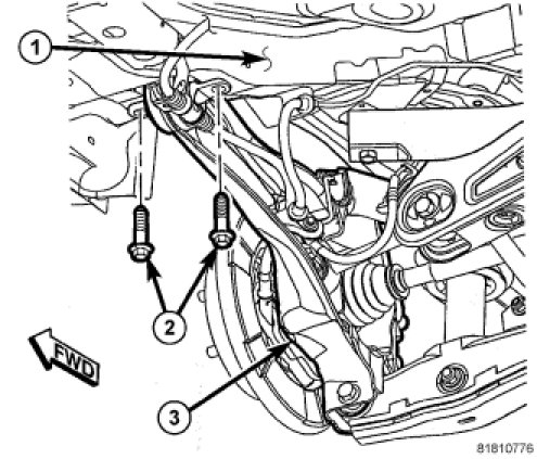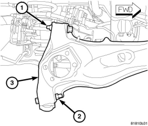 1. Position the trailing link and install the two bolts (2) fastening the leading end of the trailing link (3) to the body (1). Tighten the two mounting bolts to 110 Nm (81 ft. lbs.).