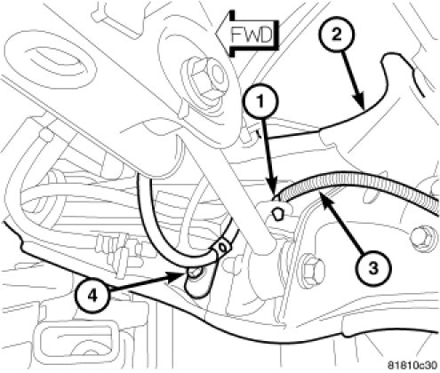 9. If equipped, position the wheel speed sensor (3) and install the screw (4) fastening the sensor to the trailing link (2). Tighten the mounting screw to 18 Nm (13 ft. lbs.).