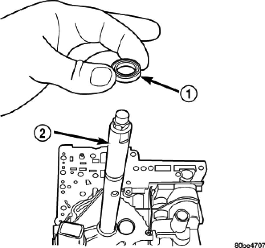1. Install the TRS (2) to the manual shaft. Make sure TRS locating pin rests in manual valve bore slot.