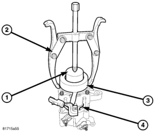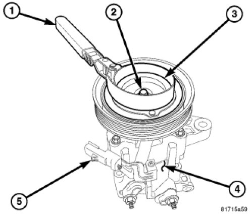 11. Using compressor field coil remover (Special Tool 9354 in Kit 9349) (1) and a two jaw puller (2), remove the clutch field coil (3) from the front of the A/C compressor (4).