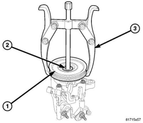 9. Remove the pulley and bearing assembly (1) from the front of the A/C compressor (2). If required, install a two jaw puller (3) and turn the puller center-bolt clockwise until the pulley and bearing assembly is completely removed.