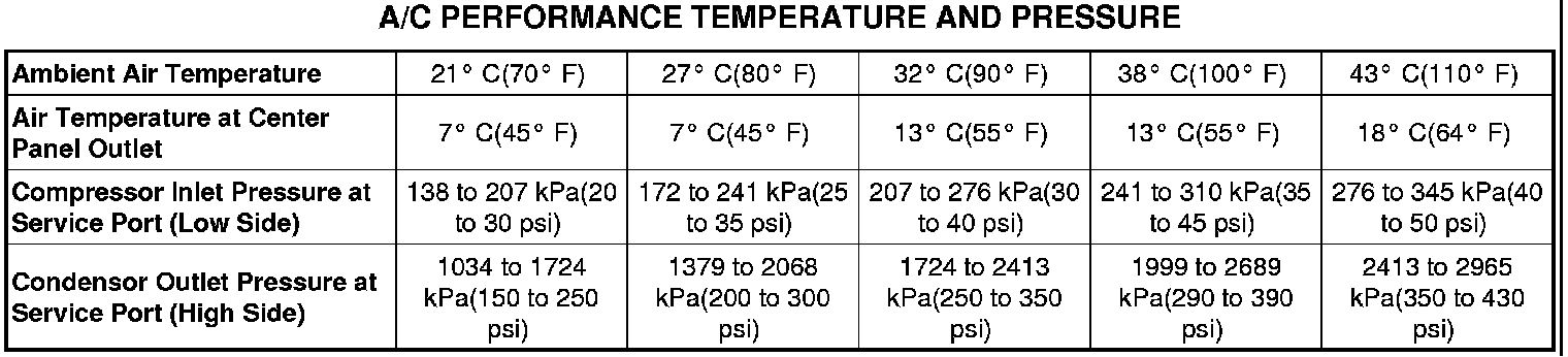 5. With the A/C compressor clutch engaged, compare the air temperature at the center panel outlet and the A/C compressor discharge pressure (high side) to the A/C Performance Temperature and Pressure chart. The compressor clutch may cycle, depending upon the ambient temperature and humidity. If the clutch cycles, use the readings obtained before the clutch disengaged.