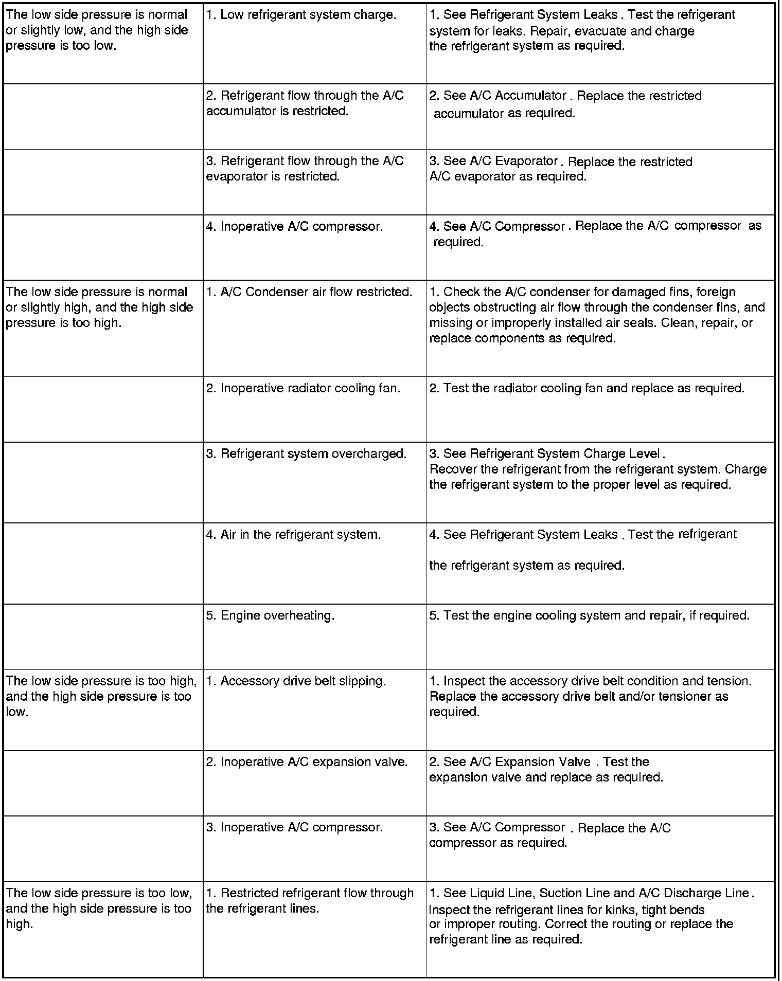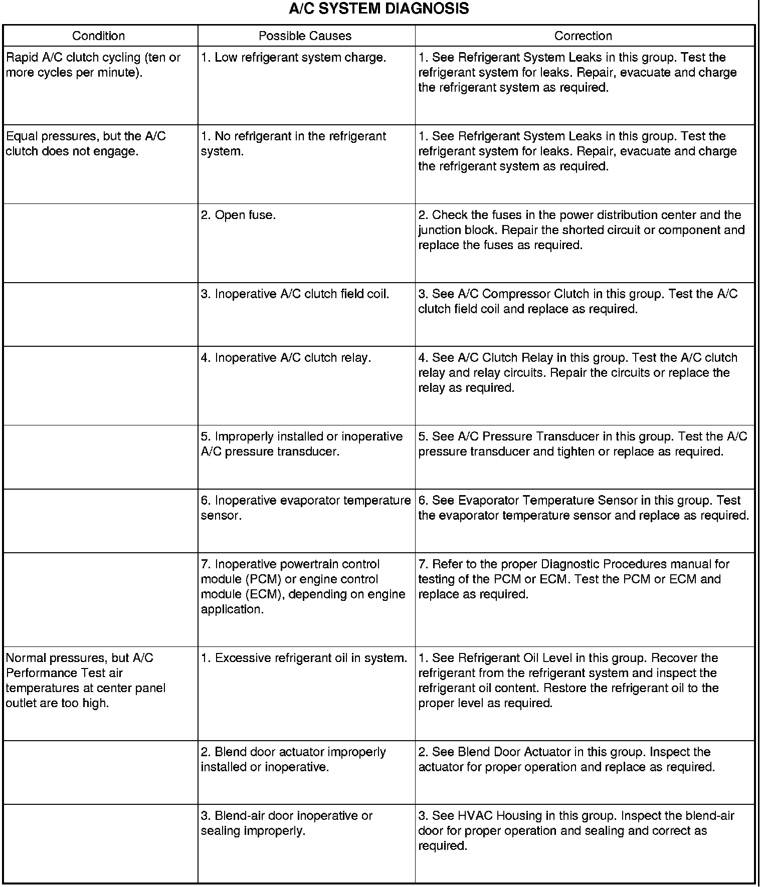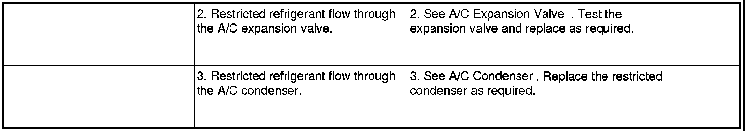 6. If the air outlet temperature fails to meet the specifications in the A/C Performance Temperature and Pressure chart, or if the A/C compressor discharge pressure is high, refer to the A/C System Diagnosis chart.