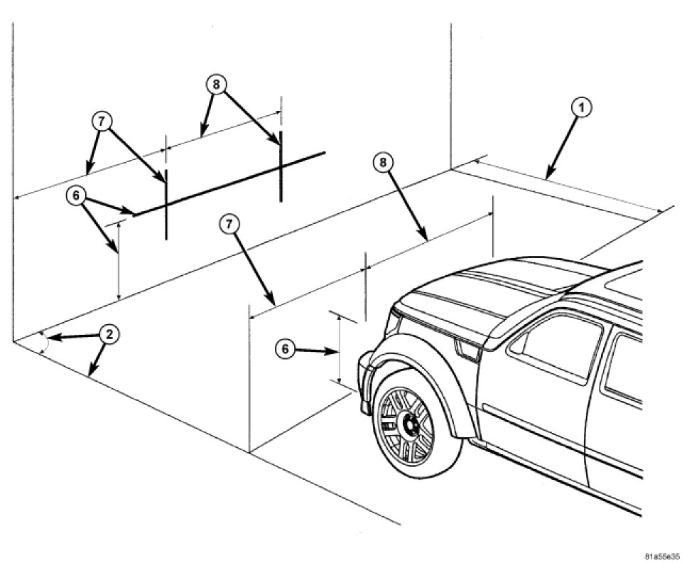 2. An adjacent wall or floor member that is perpendicular to the alignment screen can be used as the vertical zero reference. If there is no adjacent wall or floor member that is perpendicular to the screen, tape a second line on the floor perpendicular to both the alignment screen and the first line, and outboard of either side of where the vehicle will be positioned. This will be used as the vertical zero reference.