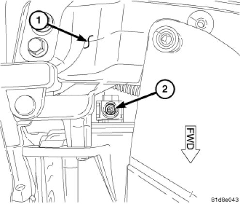 2. On all vehicles except those with headlamp leveling, use a screwdriver to rotate the headlamp vertical adjustment screw (2) on the back of the front lamp unit just inboard of the fender and forward of the upper radiator crossmember (1) to adjust the beam height as required.