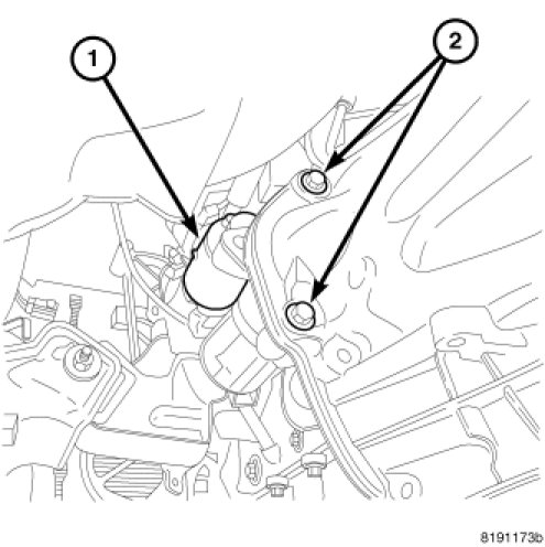 3. Position starter motor to transmission. Install and tighten two mounting bolts (2). Refer to Torque Specifications.