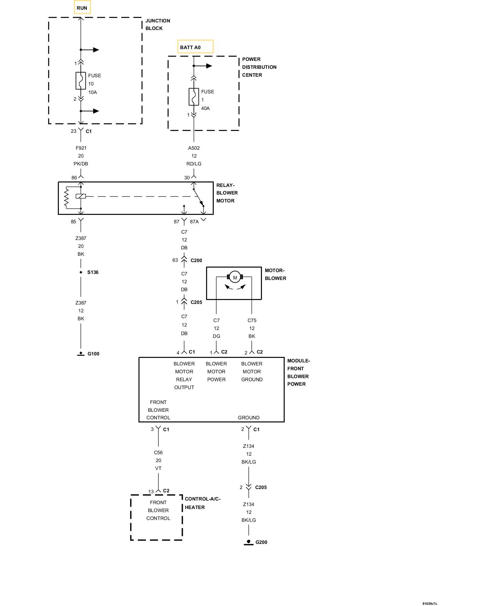 - Inspect the wiring harness for a condition causing the short between the (C7) Front Blower Motor Relay Output circuit / (A502) Fused B(+) circuit and ground and repair as necessary. If the inspection fails to produce the cause for the short, replace the PDC and replace the fuse.