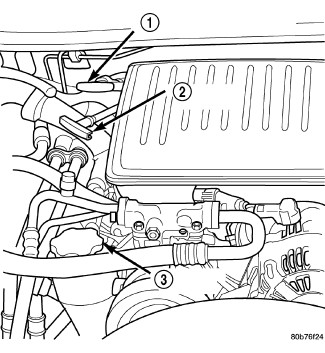 The engine oil level indicator (2) is located at the right rear of the engine on the 3.7L engines.