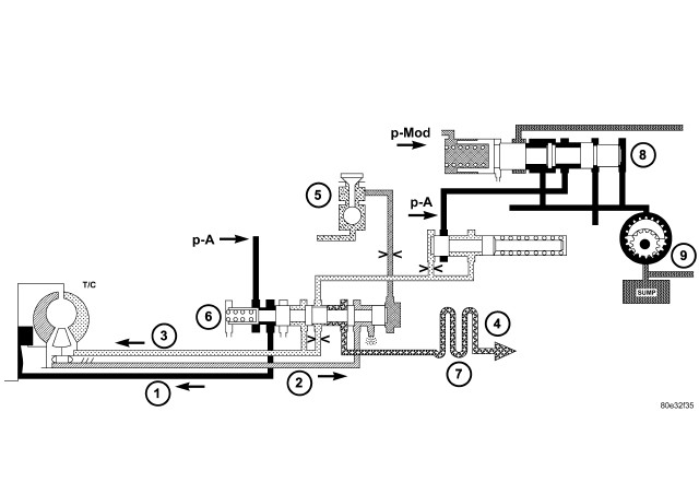 At the working pressure regulating valve surplus oil is diverted to the lubrication pressure regulating valve (1), from where the lubrication pressure (p-Sm) is used in regulated amounts to supply the transmission lubrication system including the torque converter.