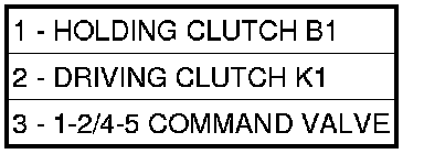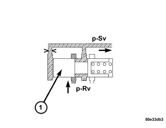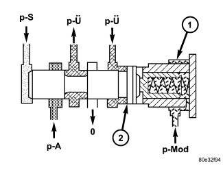 The shift pressure is determined by the shift pressure regulating solenoid valve and the shift pressure regulating valve (1). In addition, pressure from the clutch K2 is also present at the annular surface of the shift pressure regulating valve. This reduces the shift pressure in 2nd gear.