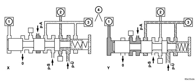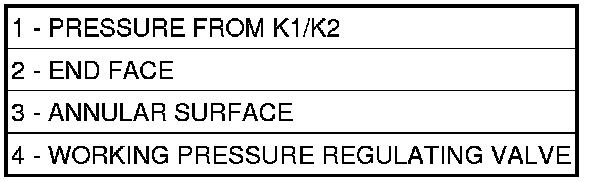 The working pressure (p-A) is regulated at the working pressure regulating valve (4) in relation to load (modulating pressure, p-Mod) and gear (K1 or K2 pressure) (1). The spring in the working pressure regulating valve sets a minimum pressure level (basic pressure).