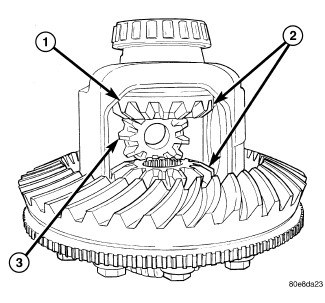 3. Install first pinion gear (3) with thrust washer into differential window (1) and side gears (2). Rotate pinion gear into the case.