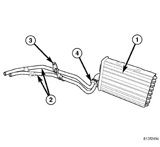 The heater core (1) is mounted into the HVAC air distribution housing, located behind the instrument panel. The heater core is a heat exchanger made of rows of tubes and fins. The heater core tubes (2) are attached to the HVAC housing by a bracket and screw (3) and to the heater core by a flange and bolt (4).