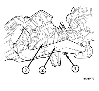 1. Carefully install the heater core (8) into the passenger side of the HVAC air distribution housing (2).