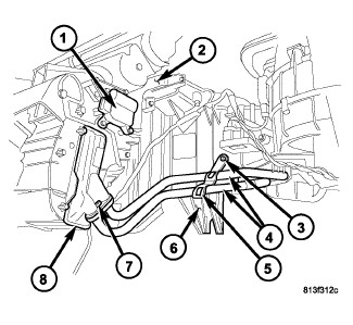 6. Install the bolt (7) that secures the heater core tubes to the heater core. Tighten the bolt securely.