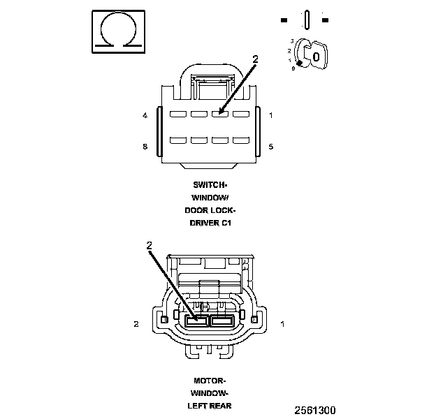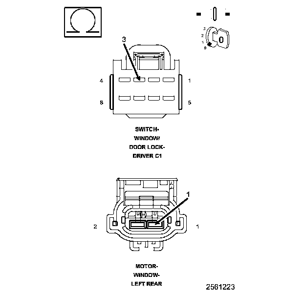 2. Measure the resistance between the Master Window Switch Left Rear (Up) circuit in the Driver Window Switch C1 connector and the Left Rear Window Driver (Up) circuit in the Left Rear Window Motor connector.