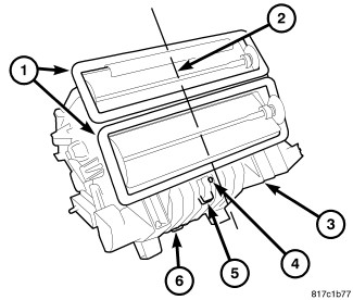 3. Align the air door(s) with the pivot shaft hole(s) in the air distribution housing (3) and install the two halves of the housing together. Make sure the three plastic retaining tabs (6) are fully engaged.