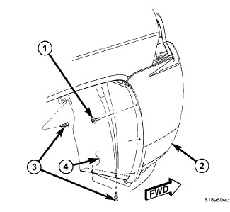 4. Position the front of the front wheel house splash shield (4) to the front fascia (2) closure panel and secure it with two push pin fasteners (3).