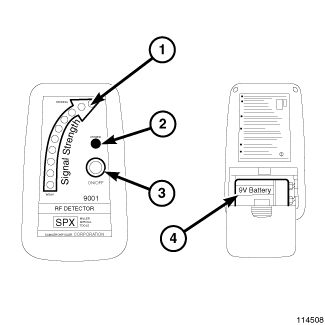 Using special tool 9001, first test to ensure that the transmitter is functioning. Typical testing distance is 2.5 centimeters (1 inch) for Asian transmitters and 30.5 centimeters (12 inches) for all others. To test, position the transmitter as shown. Press any transmitter button, then test each button individually. The tool will beep if a radio signal strength that lights five or more LEDs is detected. Repeat this test three times. If transmitter fails any of the test refer to the Diagnostic information.