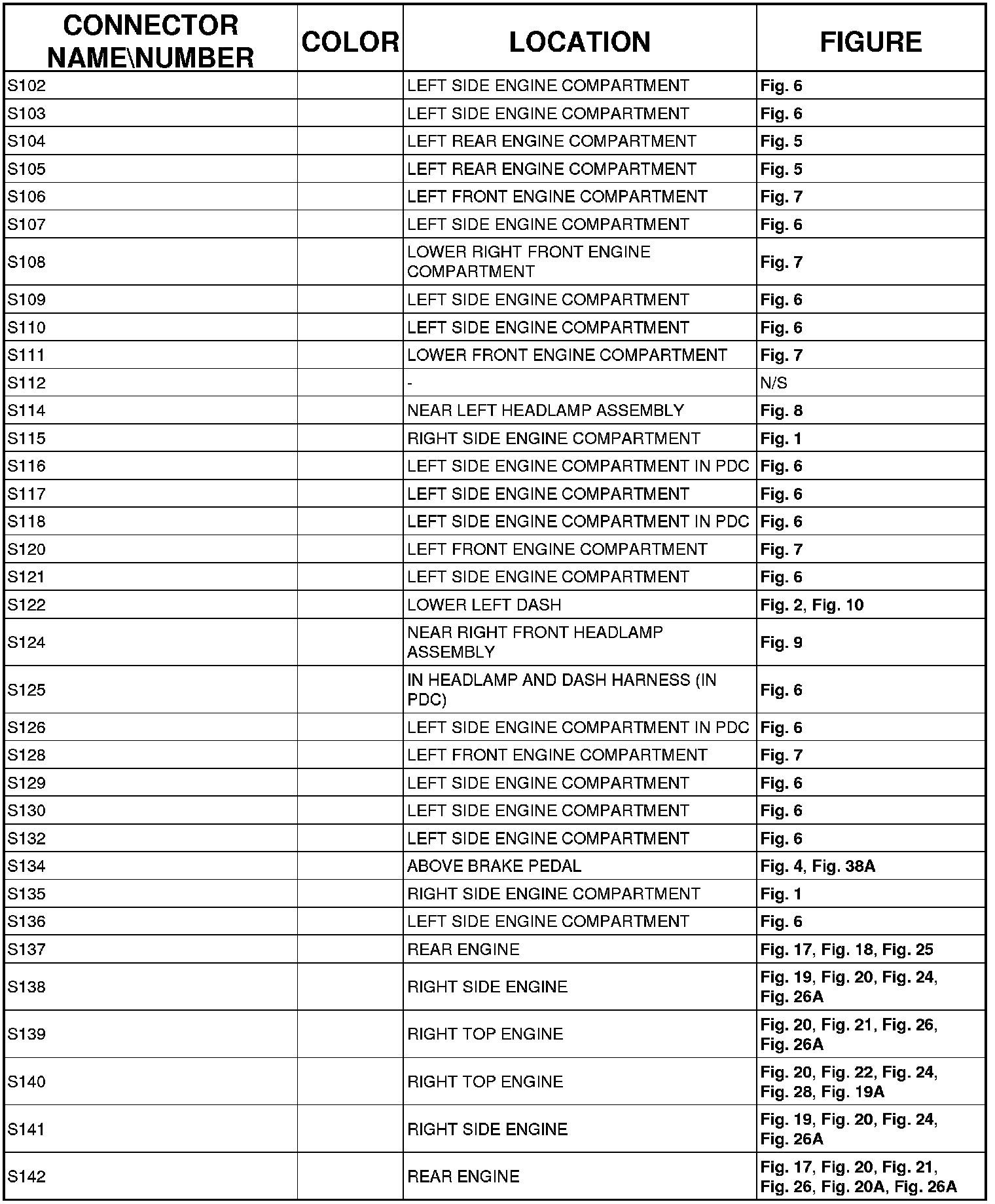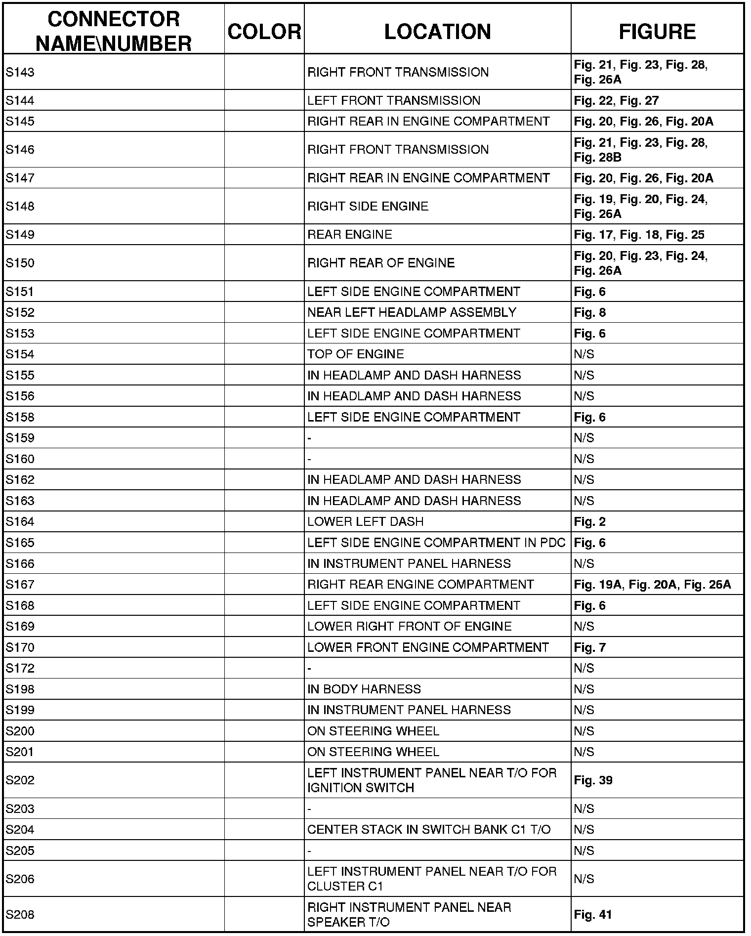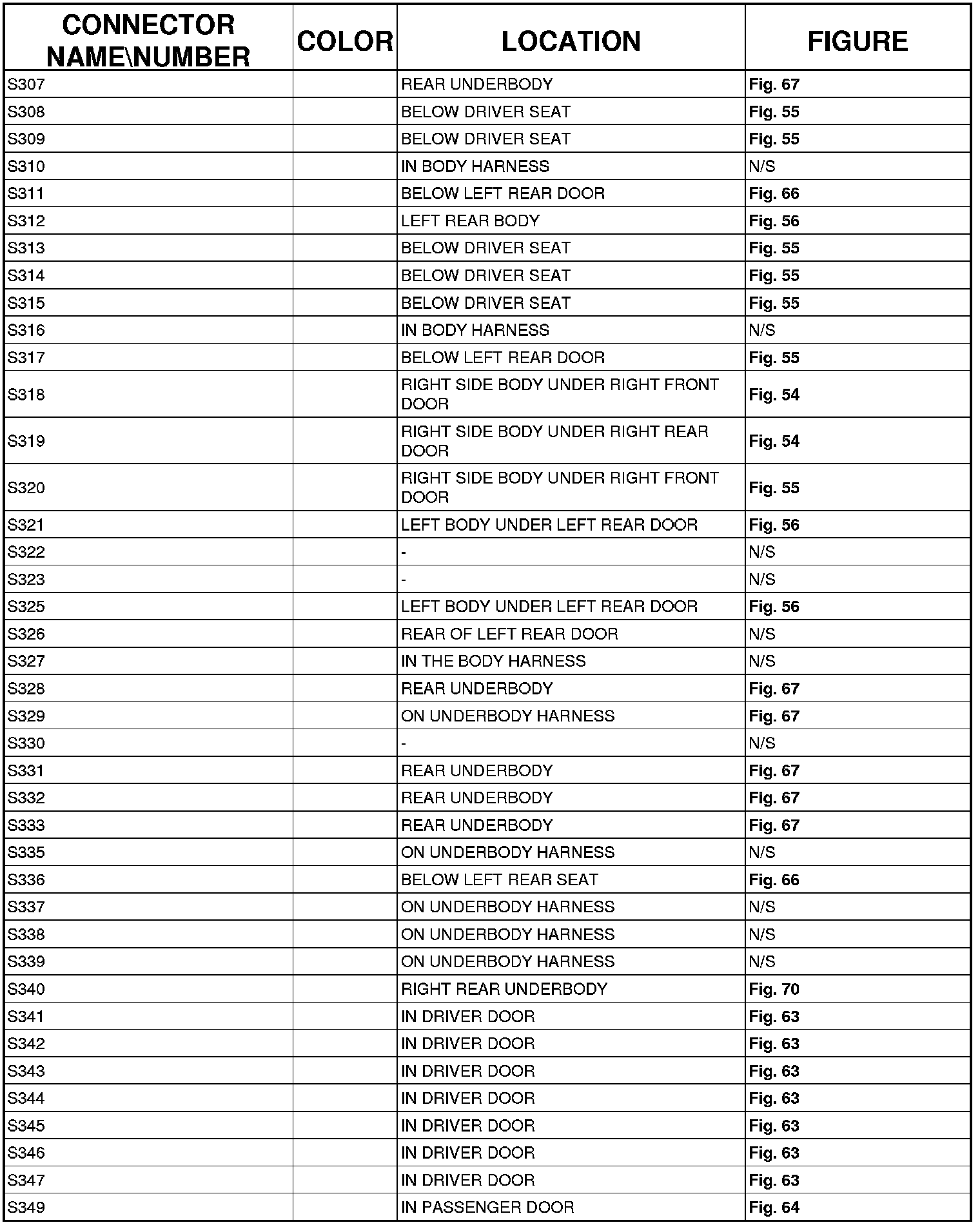 The abbreviation T/O (Take Out) is used in the location column to indicate a point in which the wiring harness branches out to a component.