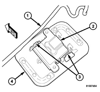 5. Carefully pull down the right rear edge of the headliner (1) from the upper liftgate opening far enough to reach between the headliner and the roof panel to access the transmitter (2) and mounting bracket (4) on the headliner substrate.