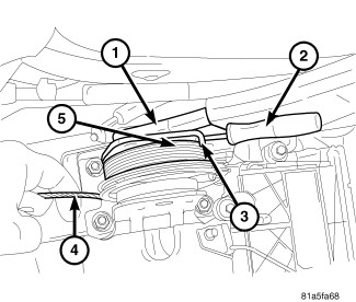2. With lever in DOWN position, pull up on the core cable (4) rotating the drum (5) until the drum cut-out aligns with hole on lever tab (3), then install a punch (2) in this hole and drum cut-out. Release grasp on core cable.