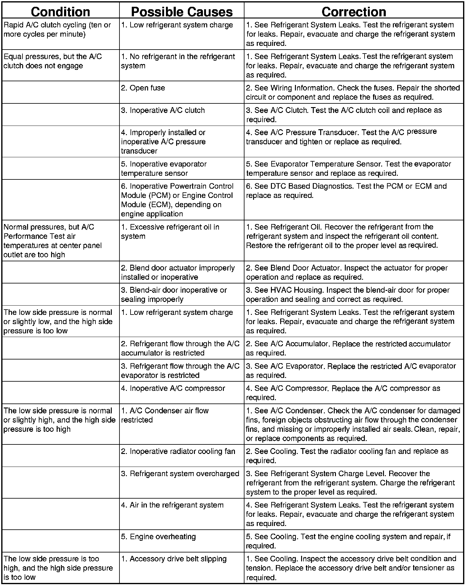 - A/C-heater controls set to Recirculation mode (max-A/C), full cool, panel mode, high blower and with A/C compressor engaged. If the A/C compressor does not engage, see the A/C System Diagnosis table.