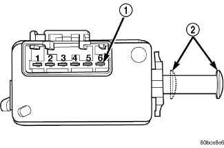 3. Using an ohmmeter, perform the continuity tests at the terminal pins (1) in the brake lamp switch connector receptacle as shown in the Brake Lamp Switch Tests table.
