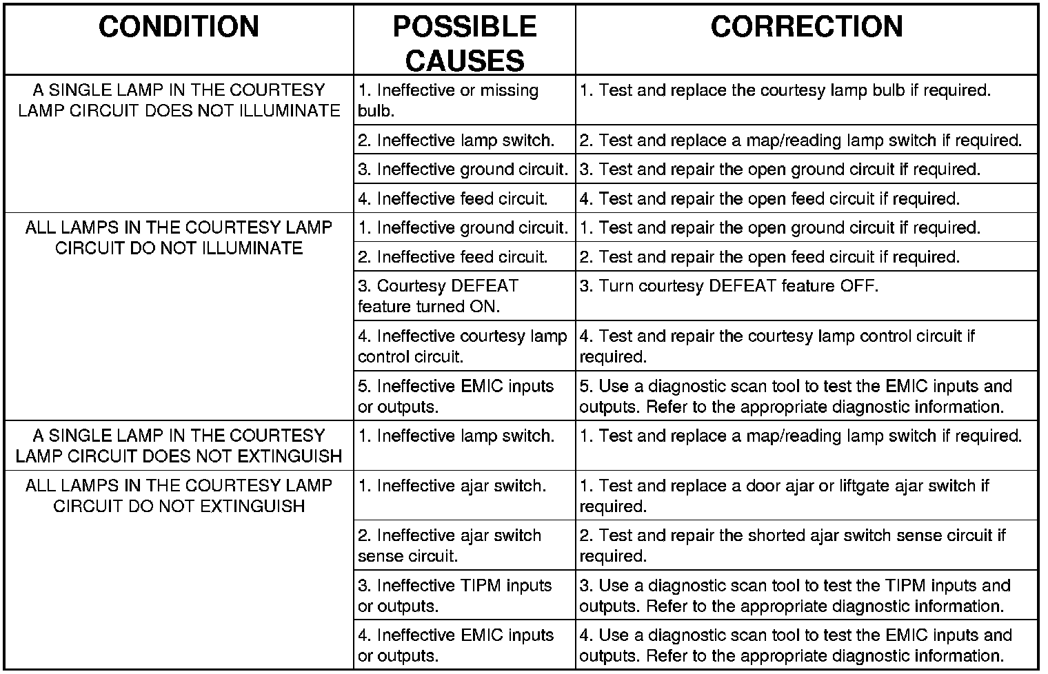 NOTE: When diagnosing the interior lighting circuits, remember that high generator output can burn out bulbs rapidly and repeatedly; and, that dim or flickering bulbs can be caused by low generator output or poor battery condition. If one of these symptoms is a problem on the vehicle, be certain to diagnose the battery and charging system, then repair as necessary.