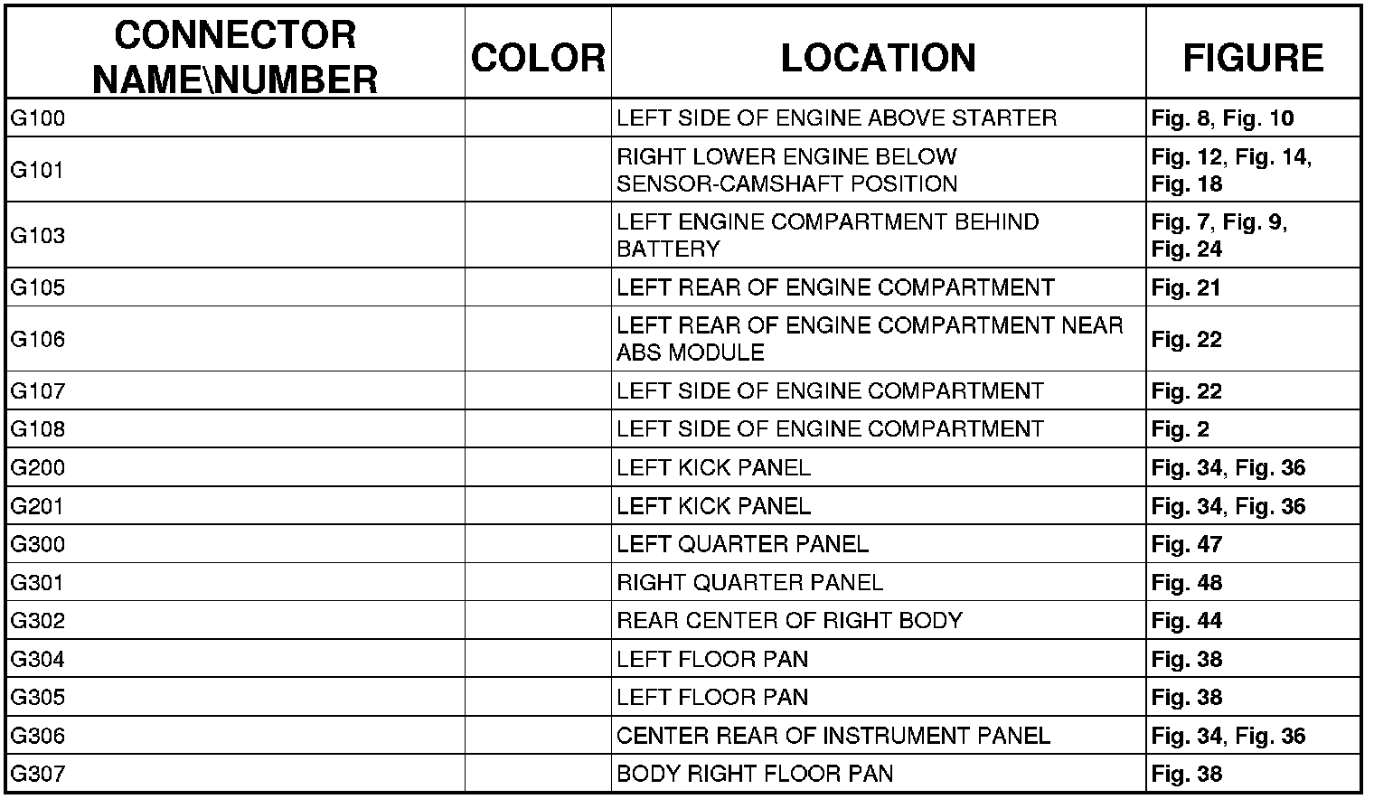 The abbreviation T/O (Take Out) is used in the location column to indicate a point in which the wiring harness branches out to a component.