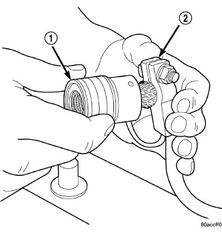 1. Clean the battery cable terminal clamps (2) of all corrosion. Remove any corrosion using a wire brush (1) or a post and terminal cleaning tool, and a sodium bicarbonate (baking soda) and warm water cleaning solution.