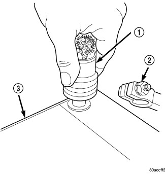 3. If the removed battery is to be reinstalled, clean the outside of the battery case (3) and the top cover with a sodium bicarbonate (baking soda) and warm water cleaning solution using a stiff bristle parts cleaning brush (1) to remove any acid film. Rinse the battery with clean water. Ensure that the cleaning solution does not enter the battery cells through the vent holes. If the battery is being replaced, Battery for the factory-installed battery specifications. Confirm that the replacement battery is the correct size and has the correct ratings for the vehicle.