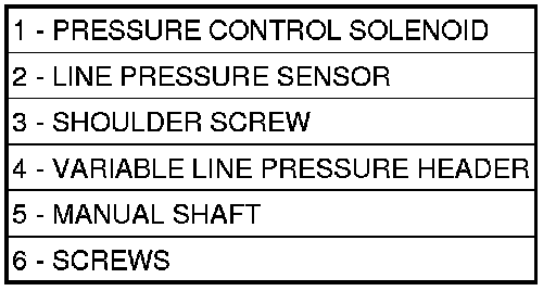 3. Remove the screws (6) holding the pressure control solenoid (1) and line pressure sensor (2) to the valve body.