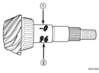 Ring gear and pinion are supplied as matched sets. Identifying numbers for the ring gear and pinion are painted onto the pinion gear shaft and the side of the ring gear. A plus (+) number, minus (-) number or zero (0) along with the gear set sequence number (2) (01 to 99) is on each gear. This first number (1) the amount (in thousandths of an inch) the depth varies from the standard depth setting of a pinion marked with a (0). The next two numbers are the sequence number of the gear set. The standard depth provides the best teeth contact pattern.