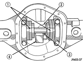 Visual inspect differential case, pinion mate shaft, axle shaft end button, C-lock, differential pinion gears, differential side gears and washers for damage or excessive wear. Replace damaged components.