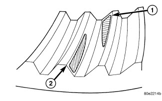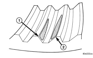 Ring gear is too close to the pinion gear, drive side toe (1) coast side heel (2). Increase backlash by moving ring away from the pinion gear using the adjusters.
