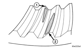 Ring gear is too close to the pinion gear, drive side toe (1) coast side toe (2). Increase backlash by moving ring gear away from the pinion gear using the adjusters.