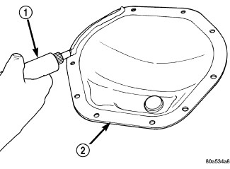 1. Apply a bead of orange Mopar(TM) Axle RTV sealant (1) or equivalent to the housing cover (2).