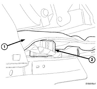 1. Lift, but do not remove, the jute covered panel (1) over the Occupant Restraint Controller (ORC) (2) mount between the dash panel and the gearshift mechanism as necessary to reinstall the ORC, its connections and fasteners.