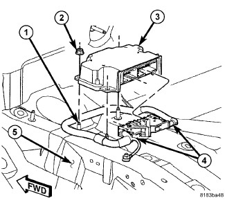 2. Carefully position the Occupant Restraint Controller (ORC) (3) onto the three studs (1) of the ORC mount on the floor panel transmission tunnel (5). The bottom of the ORC housing is keyed. When the ORC is correctly positioned, the bottom of the housing will fit flush with the mount and the orientation arrow on the label on top of the housing will be pointed forward in the vehicle.