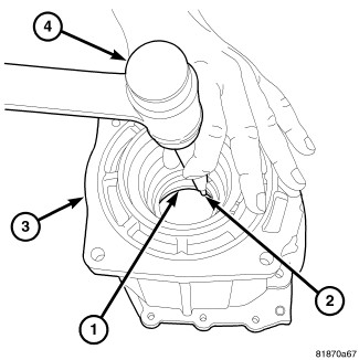 16. Using a hammer (4) and a punch (1) remove the outer pinion bearing cup (2).